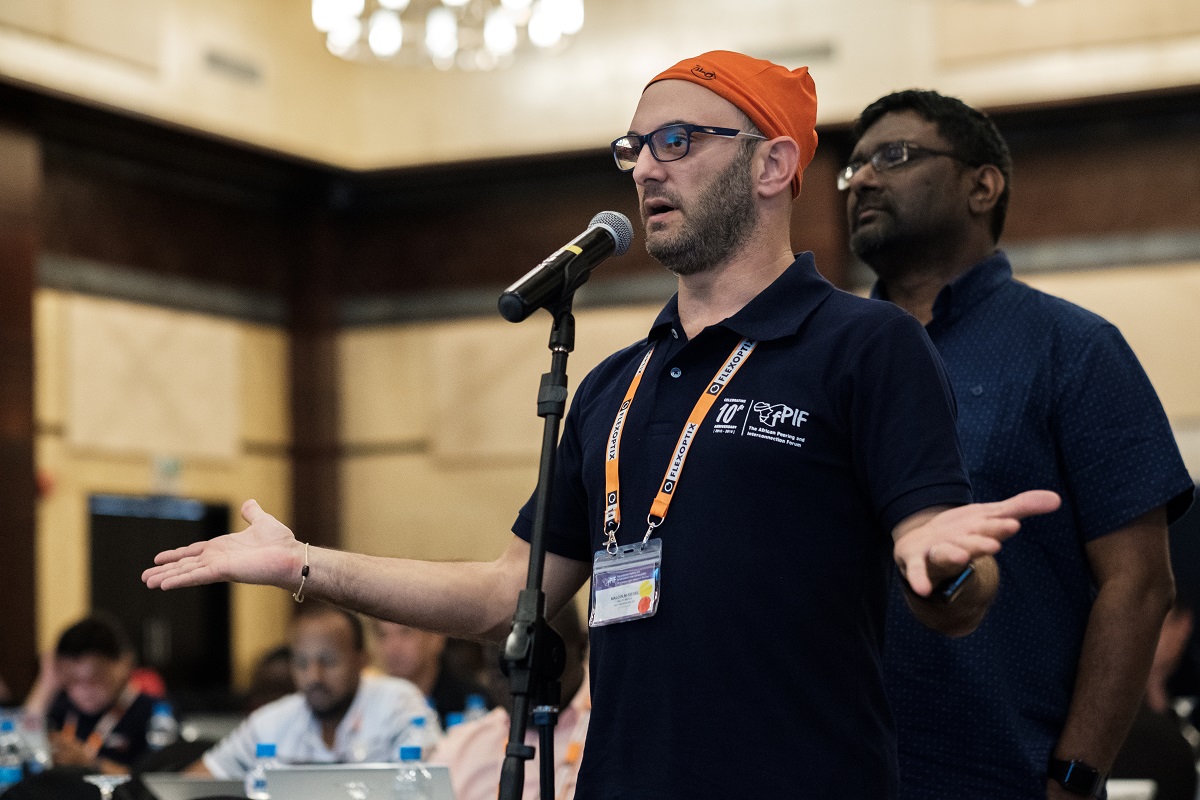 Malcolm Siegel, ISPA Board Member and a member of the AfPIF Program Committee, asking a question during a panel session on security on the third and final day of the 10th annual African Peering and Interconnection Forum (AfPIF) in Balaclava, Mauritius on 22 August 2019.